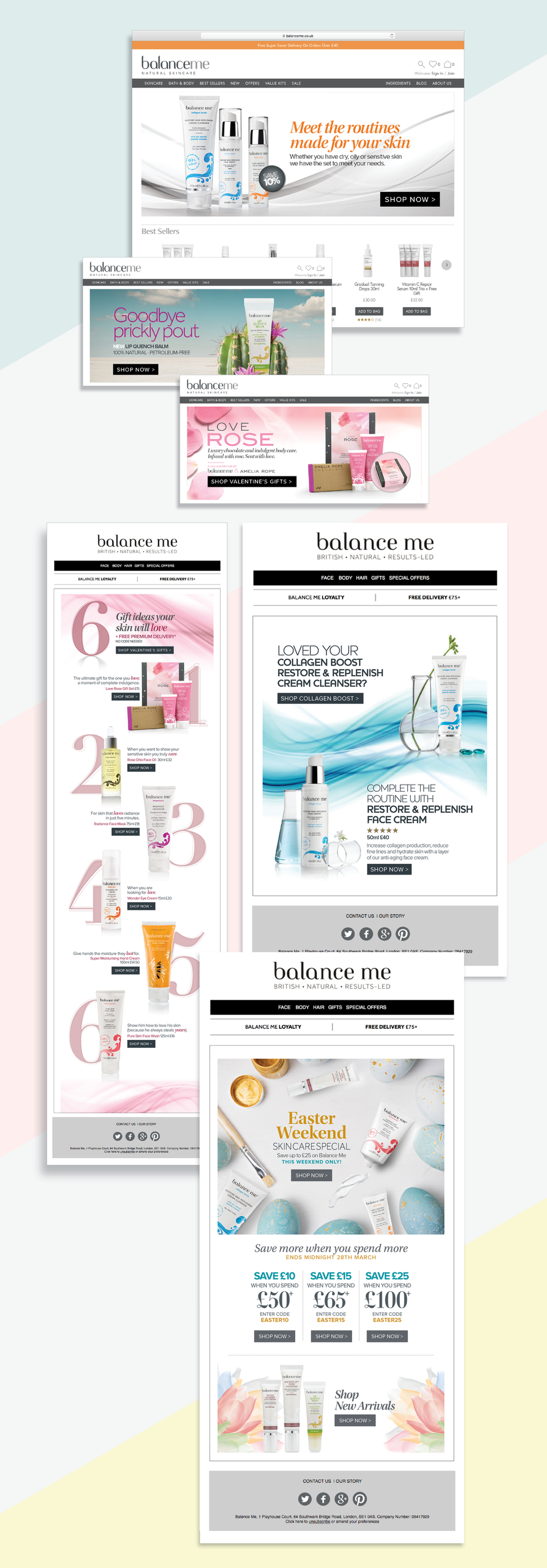 Balance Me Beauty is a popular British skincare brand that was undergoing an exciting rebrand when I joined the team. Working closely with the Creative Director, I helped to promote the company’s chic new look through digital media such as weekly newsletters and a variety of website assets. I then helped boost the brand’s retail presence through the consistent application of the updated visual standards on promotional flyers, posters and other marketing materials.